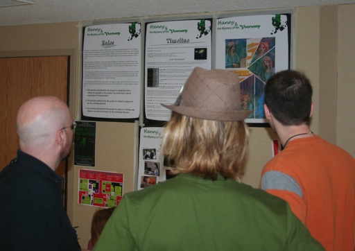 This photo shows chief wordsmith Kelly McCullough (left) using the posters to bring a couple of new potential writers up to speed on the story so far.
