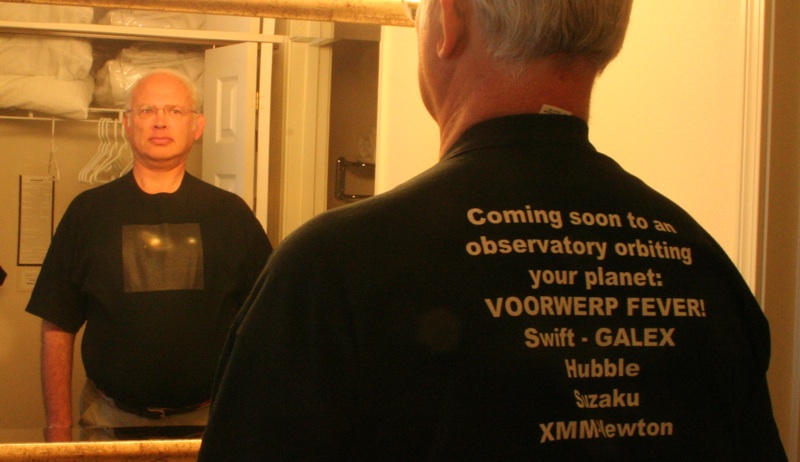 Today was  more panels, and the opportunity to meet our writers. The group of us gathered around Bill and my laptops, and in many ways it was story-telling hour as we cast the quest for understanding into comic book form. The telescopes became oracles (who sometimes deigned to give us knowledge, and sometimes rejected our petitions for an audience), and in one moment of brainstorming (not to make it into the comic) we had Comic-Book-Hanny Hanny looking at the Voorwerp and asking “What’s that?” while the Voorwerp looked back asking the same thing of all of us humans looking at it. It’s fun playing with language and ideas, even if we have to sometimes toss out the fun ideas to make sure we tell a true and scientific story. Tomorrow we meet again, at 11am central, and we’ll be twittering as we go.