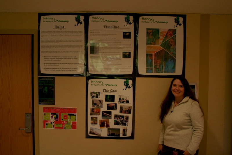 We were scheduled in a room used at other times for science demos and kids’ programs; it’s full of  such interesting things as M.C. Escher floor puzzles, tornado demonstrators, and robot parts. Pamela had prepared a set of poster-sized prints for the participants’ reference – a picture gallery, cast of characters, and some of the ground rule for the project. After today’s session these went up on the wall outside the meeting room for further reference (along with one of the small posters advertising the sessions), creating a Voorwerp Wall.