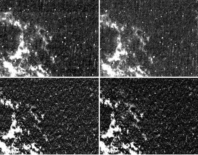 The ACS narrow-band filter data were designed to probe the Voorwerp itself, seeking fine structure that is blurred away in ground-based images. We use both the strong [O III] emission (which made it so recognizable when Hanny picked it up from the SDSS images), and the Hα line of hydrogen. Their ratio changes as the conditions ionizing the gas change, so we could watch for variations as conditions differ from place to place. This also netted us gains we hadn’t quite asked for. We also had to work for them. it was known before its repair that the CCD detectors on ACS had suffered from exposure to energetic particles in space during its decade in orbit; all such devices do to some extent. One result of this cumulative damage is that they don’t transfer charge as efficiently as they originally did, and in particular, after being struck by a charged particle (“cosmic ray”), when the image reads out, the detector registers not only a bright spot (which is easy to filter out) but a long trail, so long that it’s not at all easy to filter out without blacking out much of the image. The situation improves if you combine two images, moving the telescope slightly in between them. That lets the software reject the bright cosmic-ray spots, but even after tuning the rejection parameters, the streaks still remain down the device rows. We ended up using what we knew about the remaining trails to filter them out, at the expense of losing the dimmest, smooth regions of emission. Fortunately, these dim regions don’t have enough signal to show new features in Hubble data, so we used ground-based images to fill them in around the edges and in the fainter interior regions of the Voorwerp. This panel shows four successive stages in the process: