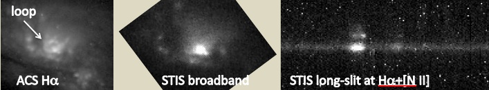 Here is that expanding loop. At left is the Hα image, showing it sticking out above the nucleus. In the middle is a broad-filter image taken to zero in the pointing to take the spectra – you don’t see the loop because it’s swamped by the starlight. At right, the spectrum near Hα showing the distinct emission-line clouds just above the nucleus.