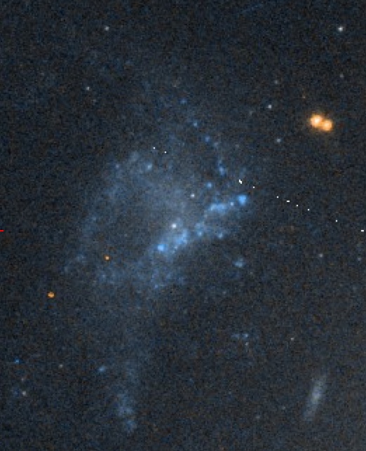 The released image product combines four filters and two cameras – the Wide Field Camera 3 (WFC3), installed during the 2009 shuttle servicing mission, and the Advanced Camera for Surveys (ACS), electronically repaired during that mission. WFC3 offers superior sensitivity and small enough pixels to exploit the telescope’s phenomenal resolution, while ACS has a set of tunable “ramp” filters that allow us to observe the wavelength of any desired spectral feature at a galaxy’s particular redshift. Our WFC3 images were designed to look at IC 2497, at wavelengths deliberately minimizing the brightness of the gas in the Voorwerp so we could also look for star clusters in its vicinity, that might tell us whether its gas came from a disrupted dwarf galaxy. (This turned out to be a good idea for a slightly different reasons). Our filter choices included one in the near-infrared, at 1.6 micrometers; one in the deep red, close to the SDSS i band, and one in the ultraviolet. Comparing these, we would be able to say something about the age of any star clusters we found. The UV image would also show whether there were any particularly bright clumps of dust, which could serve as “mirrors” so we could later measure the spectrum of the illuminating light source.