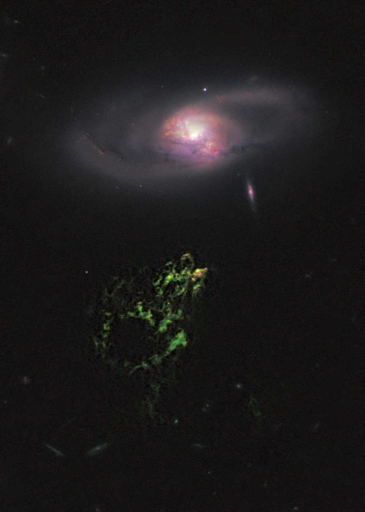 Putting it all together, here is the sequence of events that we think led to what we see today. Perhaps a billion years before our present view (which is itself 700 million years behind the times, and there’s nothing we can do about the speed of light), a merger led to IC 2497 forming from two progenitors, with its disk slowly settling but still warped. One product of this merger was an enormous tidal tail of gas, which came to stretch nearly a million light-years around IC 2497. During this process, material accreted into its central supermassive black hole, rapidly enough to produce the energy output of a central quasar as a byproduct, and illuminating and ionizing gas that was exposed to its radiation, to make the Voorwerp. About a million years before we see it, it started to blow material away (and this may have been when its radio jet and outflow started). Then, later still, the core faded, maybe as its energy output switched from being mostly in radiation to mostly powering the motion of material out of the galaxy. And now we see Hanny’s Voorwerp as a very lively echo of the past, as the last radiation from the fading core aces outward but has yet to complete the zigzag trip from galaxy to Voorwerp to us.