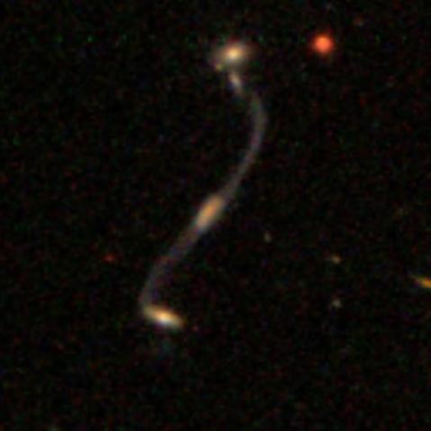 These are some really beautiful tidal tails. They are extremely long and thin and appear curiously poor in terms of star formation (very little blue light from young stars), which is odd since mergers do tend to trigger star formation. There is no spectrum so we do not know the redshift of the object. It is also not clear if the objects at either end are associated or just a projection.