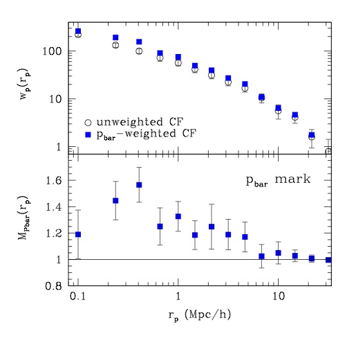 The only difference with a marked correlation function is that in addition to simple counting of pairs, each galaxy is weighted by some “mark” (or number from zero to one). For example, in our paper we mark the galaxies by the fraction of you who classified the galaxy and clicked that you saw a bar – which we called p_bar. So two galaxies with a high fraction of “bar clicks” separated by a distance r would count more in the marked correlation function than two with a low fraction of “bar clicks”.