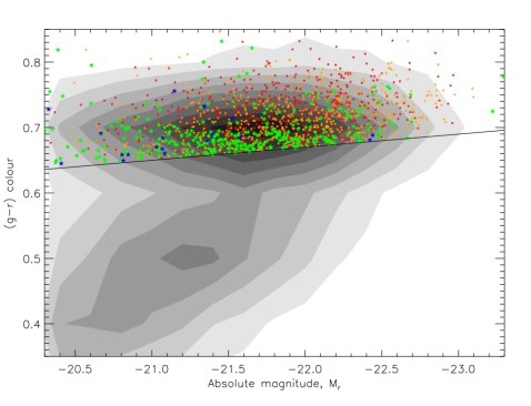 So you see the greyscale indicating a “red sequence” at the top, and a “blue cloud” at the bottom. In both cases brighter galaxies are redder.