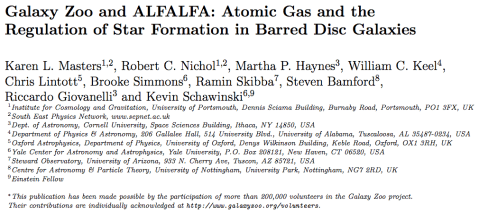 ALFALFA is a massive survey which will map the location of atomic hydrogen over basically the whole sky visible to the Arecibo radio telescope. What’s neat about a survey for something which emits as a specific frequency is that you actually get a 3D map of where the hydrogen is – both redshift and sky position! Anyway, we made use of about 40% of the survey which is already complete, and which covers about 25% of the area of the sky in which the Galaxy Zoo galaxies are found (the Sloan Digital Sky Survey Legacy Area). Adding some cuts on how face-on the galaxies are so that the bars can be identified, and to make sure the sample contains the same size galaxies right through it’s volume we ended up with 2090 galaxies with both atomic hydrogen detections and bar classifications from you guys. This is an order of magnitude larger than any similar sample! So thanks. 🙂