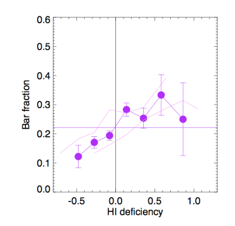 Bar fraction against how much more or less atomic gas a galaxy has than is typical for the number of stars it has. Bigger HI deficiency = less atomic gas than is normal for a galaxy’s size.