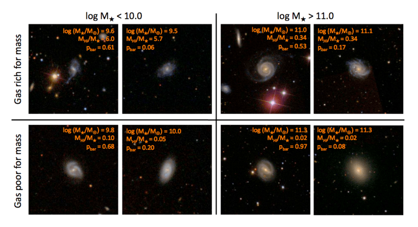 Here are some examples of low and high mass galaxies which are gas rich or poor and with or without bars. 🙂