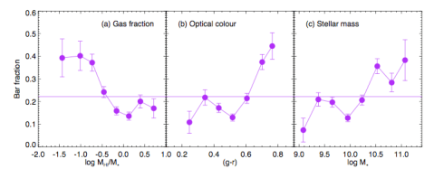 Anyway you can see we still see a clear trend, which demonstrates that it’s likely to be the atomic gas driving the correlation. Where a galaxy is richer in atomic hydrogen than normal it’s less likely to host a bar, and vice versa. Very atomic hydrogen rich galaxies which are massive and have bars are really quite rare!