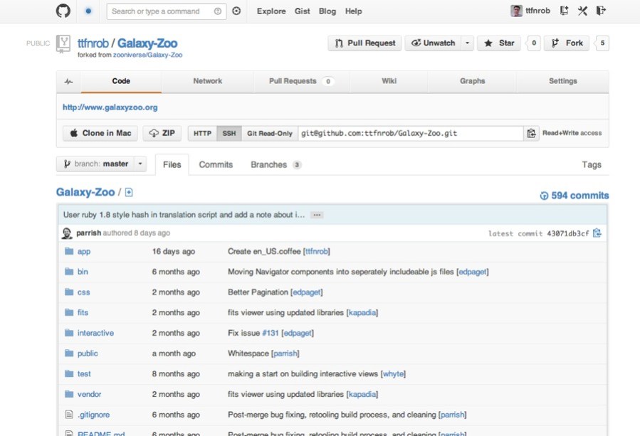 Now you have your own copy of Galaxy Zoo. This is a new repo that you can edit without affecting the main Galaxy Zoo codebase. At this point you can ‘clone’ the repo on your own machine and even run the Galaxy Zoo web app locally if you want to see how it works.