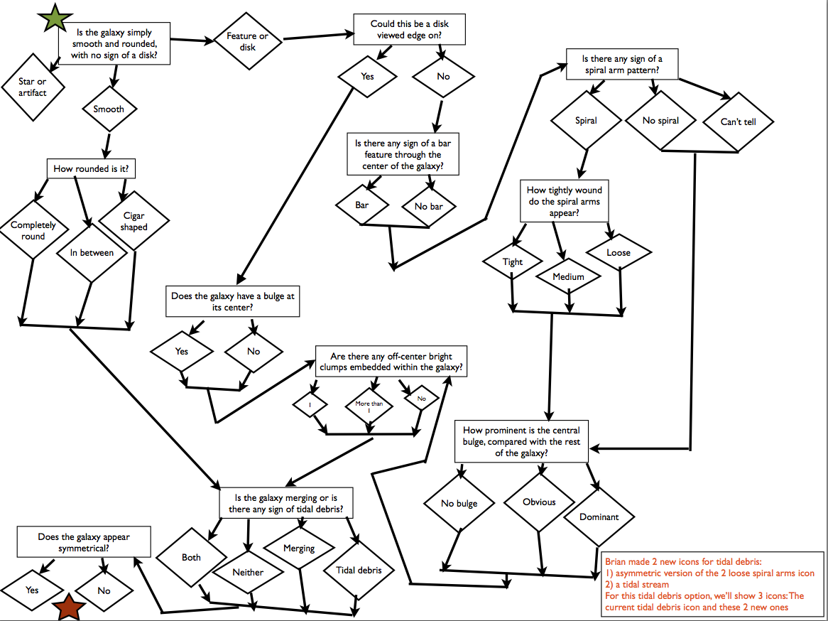 First, a quick reminder of how the data is presented. As most of you probably remember, the classification process on GZ: Quench (and all GZ projects since GZ2) is what we call a “decision tree”. We begin with a broad question on morphology (ie, “Is this galaxy smooth, or does it have features or a disk?”) for the volunteer to answer. We then ask more specific follow-up questions that depend on the previous answers. For example – if you said the galaxy doesn’t have any spiral arms, it doesn’t make sense for us to then ask you how many arms there are – it doesn’t apply to this galaxy! So, out of 11 potential questions covering galaxy morphology, a single classifier will only answer a subset (between 4 and 9) of them. Here’s a flowchart of the decision tree for GZ: Quench — it’s an interesting exercise to look at it and work out how many unique morphologies you could sort galaxies into by going through the tree.