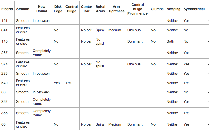 The solution we’ve adopted has been to edit the data on Tools — questions whose answers don’t apply to the consensus morphology (eg, spiral arms in a smooth galaxy, or the roundness of a spiral) are now blank. This means that if you look at the average color or size of any of these morphology properties, you’re now truly comparing similar groups of objects (apples to apples). Including other galaxies in earlier samples likely introduced a significant amount of bias – the science team thinks that this will largely help to address that.