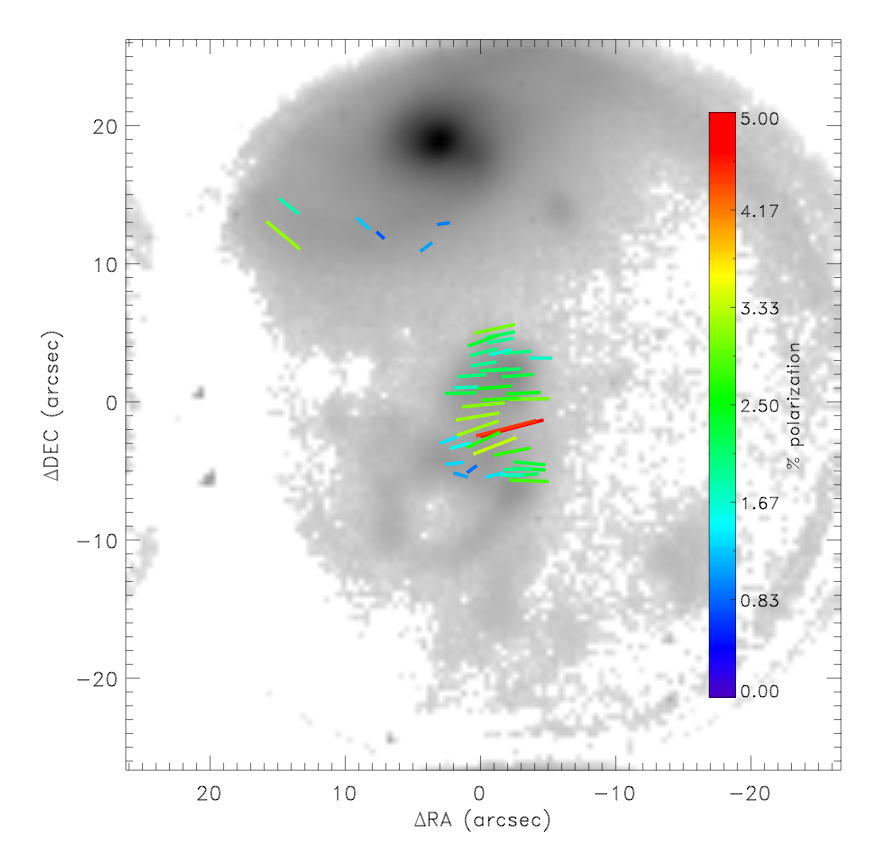For comparison, here is a polarization map of IC 2497 and Hanny’s Voorwerp itself, from data obtained last year (the first time the weather let us get useful results). Sometimes we can hear the Universe laughing – a quick simulation shows that the reflected light from the nucleus, when it was a quasar, is just a bit too faint for us to have seen its signature broad emission lines in any of the Voorwerp spectra.