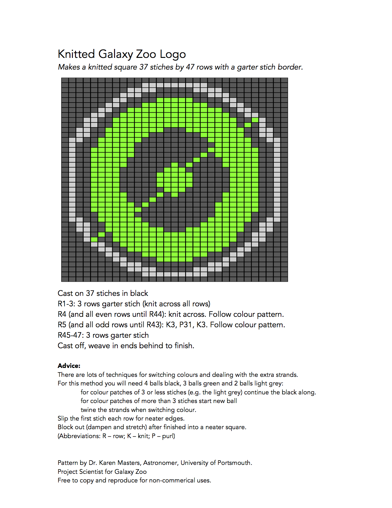 For those of you itching to stretch your creative muscles but haven’t been struck by that bolt of inspiration yet, here’s a KNITTING PATTERN (a first I believe for the Galaxy Zoo blog) for the Galaxy Zoo logo to keep you busy…