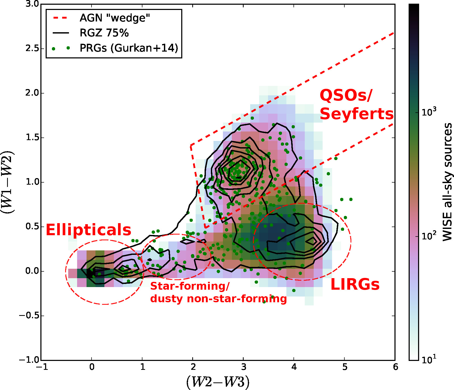 blog_fig2Caption to figure WISE colour-colour diagram, showing sources from the WISE all-sky catalog (colourmap), 33,127 sources from the 75% RGZ catalog (black contours), and powerful radio galaxies (green points) from (Gürkan et al. 2014). The wedge used to identify IR colours of X-ray-bright AGN from Lacy et al. (2004) & Mateos et al. (2012) is overplotted (red dashes). Only 10% of the WISE all-sky sources have colours in the X-ray bright AGN wedge; this is contrasted with 40% of RGZ and 49% of the Gürkan et al. (2014) radio galaxies. The remaining RGZ sources have WISE colours consistent with distinct populations of elliptical galaxies and LIRGs, with smaller numbers of spiral galaxies and starbursts.