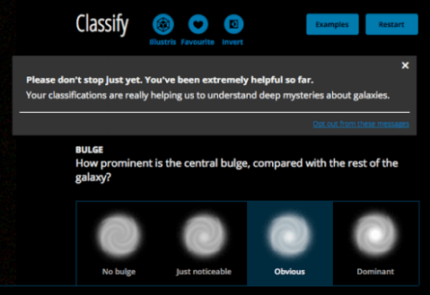 This screenshot shows an example of how the messages were shown in the Galaxy Zoo classification interface.
