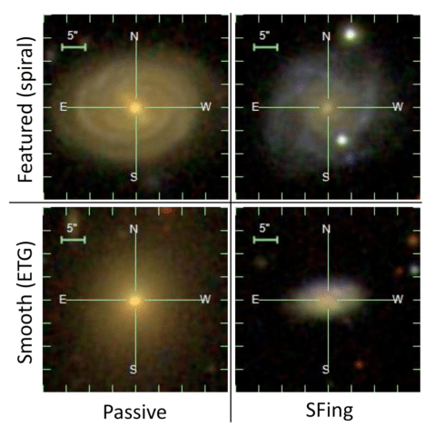The new thing here is looking at the star-formation and morphological properties of galaxies separately. So this comes right back to our discovery with the help of all of you at Galaxy Zoo (almost 10 years ago now!) that not all spirals are star-forming (blue), and not all ellipticals are passive (red).