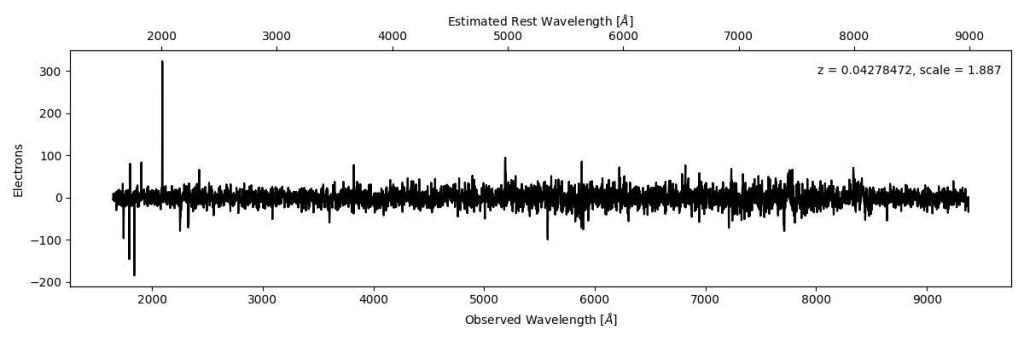 So, what do we find? Thus far, due to the adverse weather conditions caused by tropical storm Hermine on La Palma, we have set our spectroscopic observations on a single strongly barred galaxy. We have extracted the spectrum, removed any sources of contamination and reduced to only that of the bar and galactic nucleus. The top image is the spectrum from the slit at ninety degrees perpendicular to the bar direction and the bottom is aligned along it.