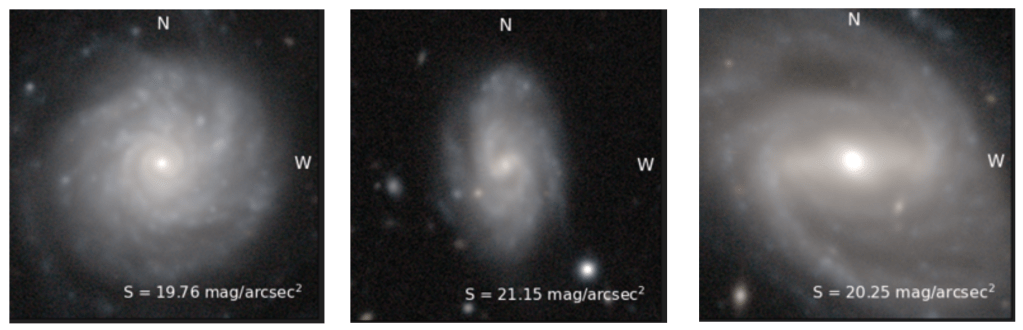 These are the questions we are going to answer at the Isaac Newton Telescope, or INT, on the island of Santa Cruz de la Palma. With a sample of 21 galaxies characterised by Galaxy Zoo – 7 strongly barred, 7 weakly barred and 7 with no bars at all – we are investigating if any relation between star formation rate and bar strength exists. An example of each type of galaxy in our sample is shown below. On the left is a galaxy with no bar at all, while on the right is a galaxy with a strong bar. The strong bar clearly dominates over the disk of the galaxy. The middle panel shows a galaxy with a much weaker bar, where the disk dominates over the disk galaxy.