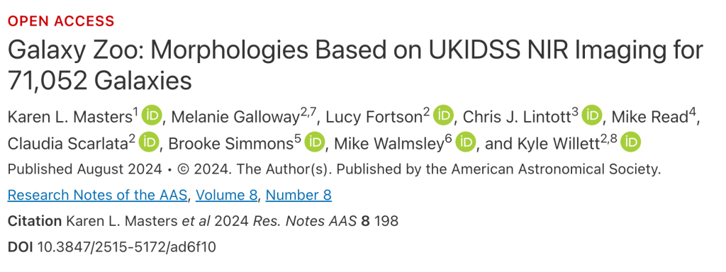 We decided to publish Galaxy Zoo: Morphologies Based on UKIDSS NIR Imaging for 71,052 Galaxies as a “Research Note of the American Astronomical Society” (RNAAS, or “Research Note” for short); a relatively new (and completely open access) publication venue from the American Astronomical Society journals. The length of these “Notes” is very limited, and you are only allowed one figure, but it gets published very quickly once it’s ready, so it seemed ideal for this short notice of the classifications being made public.