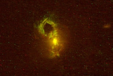 I was worried to get email this morning that there had been a failure to lock on to one of the two needed guide stars so that the telescope might have rolled enough during the observations to compromise data quality. Inspecting the data, it looks like we’re OK. We’re OK and the galaxy is strange. This is a composite of [O III] (green) and Hα (red), right out of the software pipeline without any additional processing: