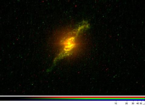 Overnight, Hubble got our first data on perhaps the most spectacular Voorwerpje host galaxy, the merging system UGC 7342. We have to wait until almost the end of the year for what we really wanted to see, the ionized gas. The telescope has particular time pressure in some parts of the sky (as if it doesn’t have extreme time pressure on everything people want to do with it), so we split the two sets of images to fit the schedule better. This time, we got data in WFC3 for two medium-width filters in the orange and deep red, selected to be essentially blind to emission from the gas. These will be used to subtract the contribution of starlight from the gas images, so we can analyze the gas properties cleanly. The emission-line images use the older ACS camera, which has a set of tunable filters which can isolate any optical wavelength we need. They come at year’s end, because we have to specify a particular range of orientation angle of the telescope to fit all the gas in their 40×80-arcsecond filter field. That, plus the requirement that the solar arrays can face the Sun directly, gives us a restricted time window.