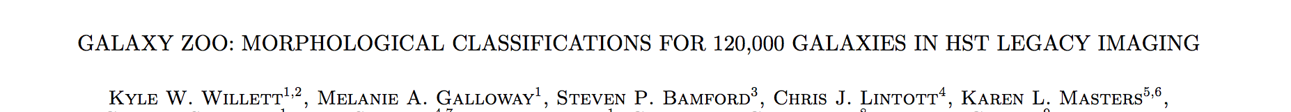 Good news! Early this morning UK time, we submitted the paper describing the finished data release for the third iteration of Galaxy Zoo to the journal Monthly Notices of the Royal Astronomical Society. It’s taken an enormous amount of work to get to this point, in particular in understanding how to account for the effects of distance on classifications. Most of that work was done by Kyle Willett and Mel Galloway from the University of Minnesota (Kyle gave a sneak preview here), and it was finished just in time because Kyle leaves us tomorrow.