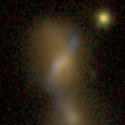 Example 4. A small satellite galaxy is merging into the larger one at the center, being ripped apart and causing tidal debris. Image courtesy DECaLS/Galaxy Zoo.