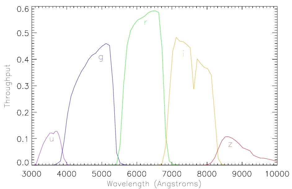 In all phases of Galaxy Zoo so far we have shown you galaxy images which are in colour. The details of how these are created varies depending on which survey the images are from. With the SDSS images, we combine information from three of the five observational filters used by Sloan (g, r, i) to produce a single three-colour image for each galaxy. We’ve talked before in more detail about how those colour images are made. All five Sloan filters and their wavelengths and sensitivity are shown below. You can probably see why we’d pick gri for our standard colour images: these are the most sensitive filters, roughly in the “green”, “red” and “infrared” (or just about) parts of the spectrum.