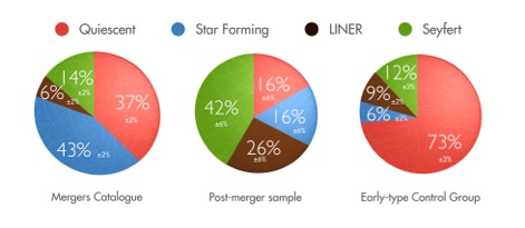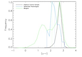 The specific subset we chose are the likely predecessors of elliptical galaxies, and we compared them to the general merger and an elliptical control sample to see how the properties of galaxies evolve along the merger. The SPMs are part of a sample classified by Galaxy Zoo as post-mergers. We looked at this sample again and we picked the ones which look mostly bulge dominated, a key feature of galaxies that are likely to be precursors of elliptical galaxies. You can see in the figure below how, even though these galaxies are similar in morphology to elliptical galaxies, they appear to be in the process of relaxing into relaxed ellipticals.