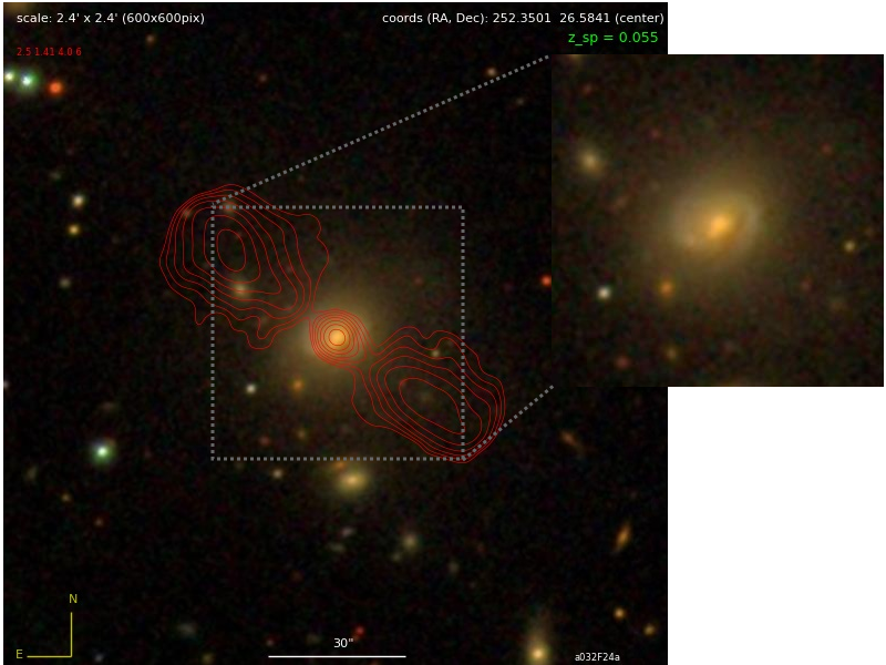 The figure above shows J1649+26, an SDRAGN published by Minnie M. in 2015 (URL Link to her paper). The red contours represent the double radio lobes emanating from the supermassive black hole of this galaxy.