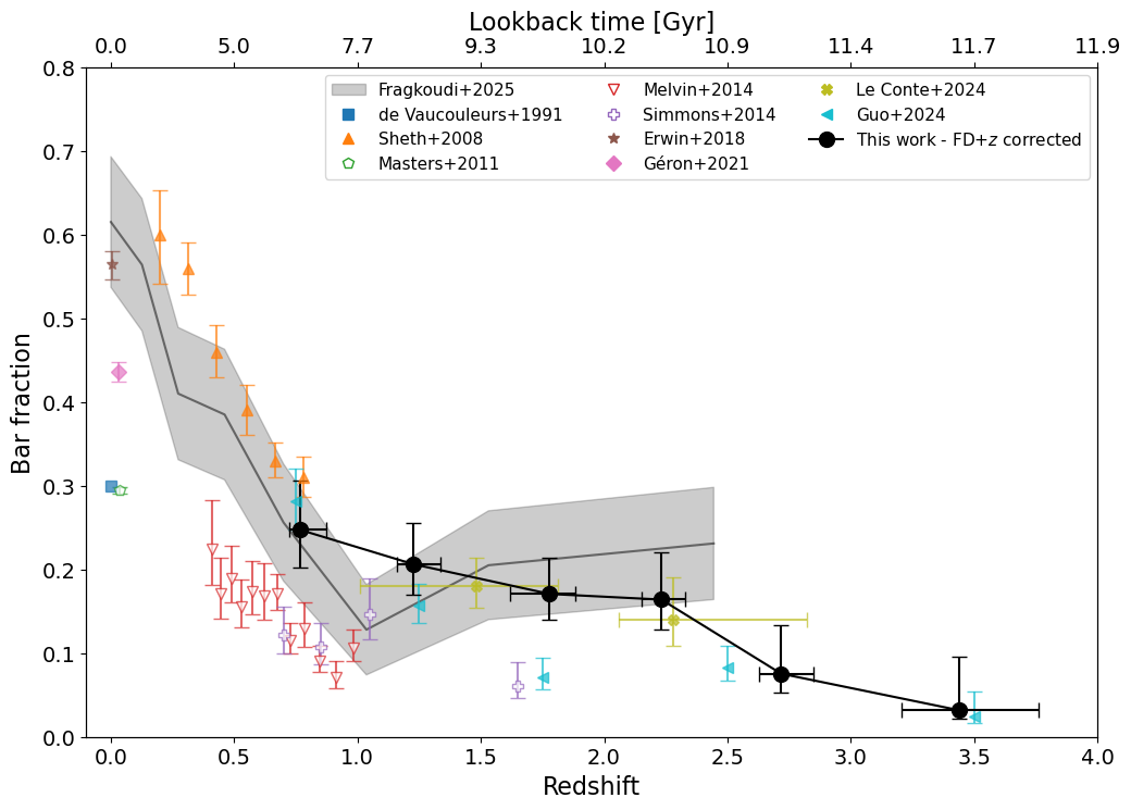 The main conclusion from this plot is that this line is decreasing; i.e. there are fewer bars at higher redshifts. This is consistent with the picture that most galaxies start without a bar. At the highest redshift probed (z = 4), fewer that 5% of disc galaxies have a bar. Over time, more and more galaxies form bars, to such an extent that in the present-day Universe, roughly half of all disc galaxies have a bar!