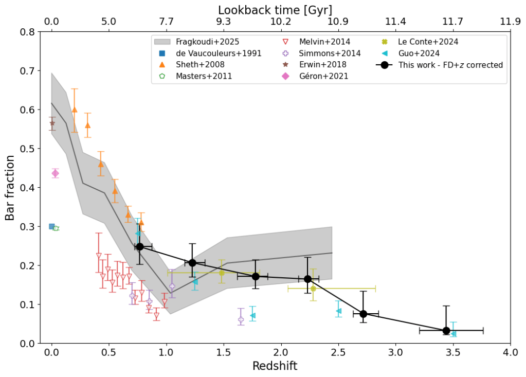 Great – so we now have found bars at high redshifts. However, in order to do some science, we want to know what fraction of galaxies host such bars at any given redshift. This is shown in the image below.