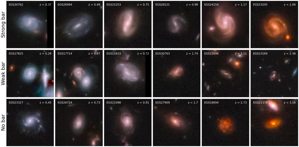 Using data from GZ CEERS, we tried to study bars up to a redshift of 4. This sounds a bit abstract, but it corresponds to looking back roughly 12 billion years in time! The Universe is only ~13.7 billion years old, so we are able to study bars over most of the history of the Universe. How cool is that? Without further ado, here are some cool pictures.
