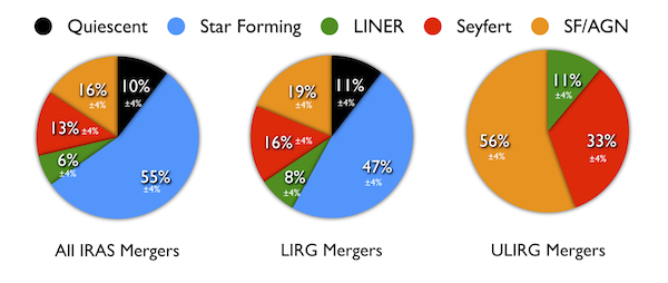 TV News says we don’t see any significant difference between the general IRAS-detected and the Luminous infrared galaxies. However, when we look at the most luminous infrared galaxies, the ULIRGs the fraction of AGN rises dramatically. This result is important because it conforms to many other studies on the role of AGN in ULIRGs.