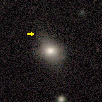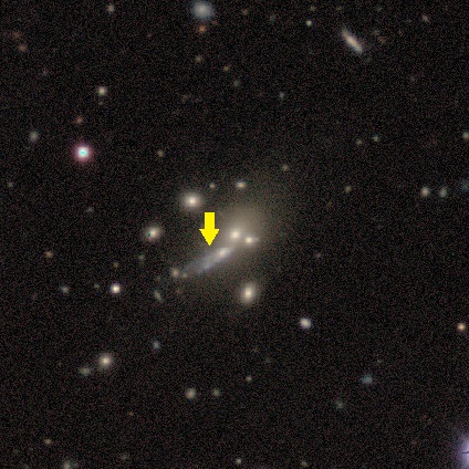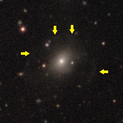 Example 2. Faint tidal debris is visible around the main galaxy in a shell-like shape (see arrows). Image courtesy DECaLS/Galaxy Zoo.