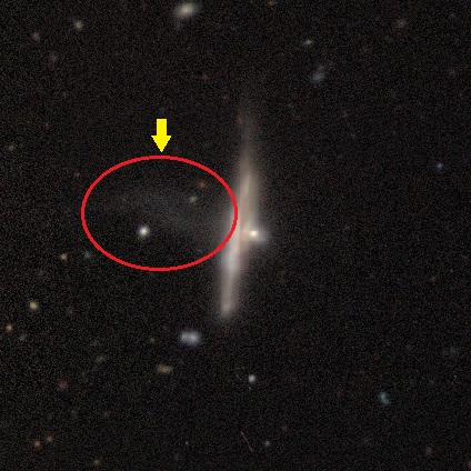 Example 1. Faint tidal debris extension is visible to the upper left of the main galaxy. Image courtesy DECaLS/Galaxy Zoo.