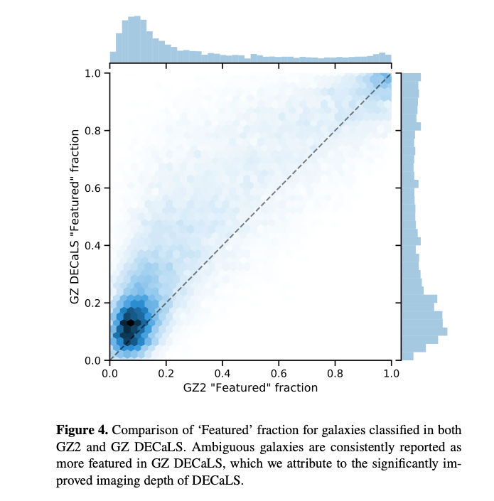 The results are dramatic! In the figure above you can see a comparison between the fraction of votes a galaxy received for being ‘featured’ in our previous data release, compared to with the new DECaLS imaging. If the new imaging made no difference, the galaxies would all lie on the dotted line, but they’re mostly above it – volunteers are seeing more features in galaxies in deeper imaging. All of which makes sense, but it’s still gratifying.