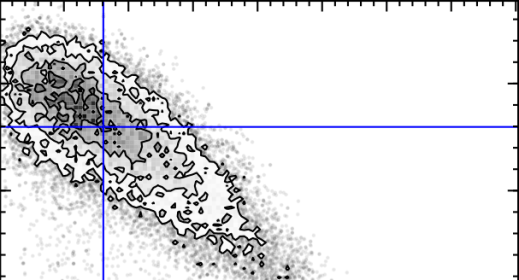 The first MC – Markov-Chain – just means an efficient random walk. We send “walkers” to have a look around for a good tq and tau, but the direction we send them to walk at each step depends on how good the tq and tau they are currently at is. The upshot of this is we quickly home in on a good value of tq and tau. The second MC – Monte Carlo – just picks out random values of tq and tau and tests how good they are by comparing the UVJ colours and our SFR model. Figure 2 shows a gif of a MCMC simulation of a single galaxy. The histograms shows the positions of the walkers searching the tq and tau space, and the blue crosshair shows the best fit value of tq and tau at every step. You can see the walkers homing in and settling down on the best value of tq and tau. I ran this simulation by running a modified version of the starpy code.