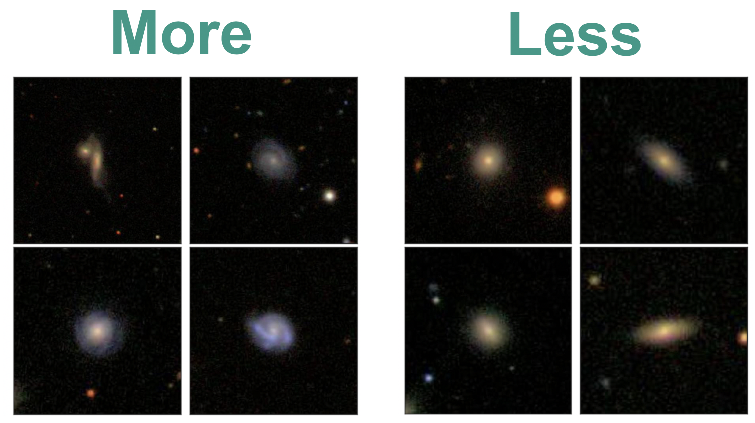 What does this mean in practice? Those choosing the ‘Enhanced’ workflow will see somewhat fewer simple galaxies (like the ones on the right), and somewhat more galaxies which are diverse, interesting and unusual (like the ones on the left). You will still see both interesting and simple galaxies, and still see every galaxy if you make enough classifications.