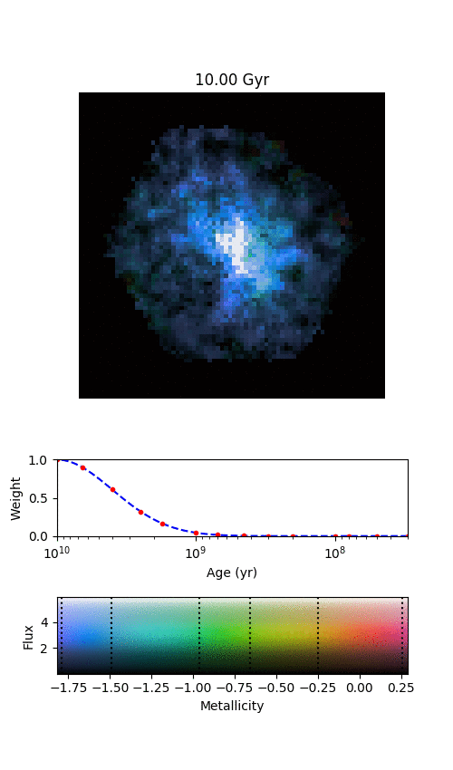 An example galaxy in MaNGA, where we’ve managed to split the galaxy into different stellar populations of different ages. Each frame shows where we find stars of a given age in this galaxy, starting from the oldest stars and finishing with the most recently formed stars. The colour denotes the mean metallicity of the stars, shown by the scale at the bottom.