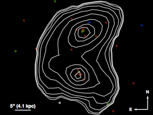 Image of the one merger with two feeding black holes. The white contours are the optical (SDSS) image while the pixels are X-rays. The red pixels are soft (low energy) X-ray photons, while the blue are hard (high energy) photons. You can see that both nuclei of the merger are visible in X-rays emitted by feeding supermassive black holes.